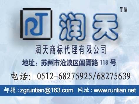 苏州润天商标事务所0512-68275925是国家商标局在苏州地区专业从事商标注册申请、续展、转让、商标监测、知识产权诉讼、苏州软件著作权登记\苏州版权登记代理等知识产权服务的专门机构。条形码登记代理|苏州商标申请|苏州商标代理|昆山商标代理|苏州商标|苏州商标注册|苏州商标|知识产权诉讼代理|苏州商标注册公司|吴江商标注册公司|太仓商标注册|太仓商标注册申请|太仓商标注册公司|昆山商标注册公司|吴江商标注册公司|商标转让申请|商标续展申请|商标设计|苏州LOGO设计|商标查询|商标免费查询|苏州工业园区商标注册|苏州新区商标注册苏州商标公司|苏州商标注册|苏州商标代理公司|苏州商标事务所|苏州商标注册公司|苏州商标设计|苏州商标代理|苏州商标网|苏州商标注册事务所|苏州商标注册流程|苏州润天商标代理有限公司0512-68275925|0512-68275639联系电话:13812645181|联系人:康秀|网址:WWW.RUNTIAN.NET |