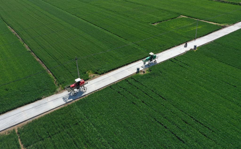 4月23日,邢台市南和区史召乡果寨二村农民驾驶农业机械前往麦田喷洒农药(无人机照片)。 新华社记者 王晓 摄